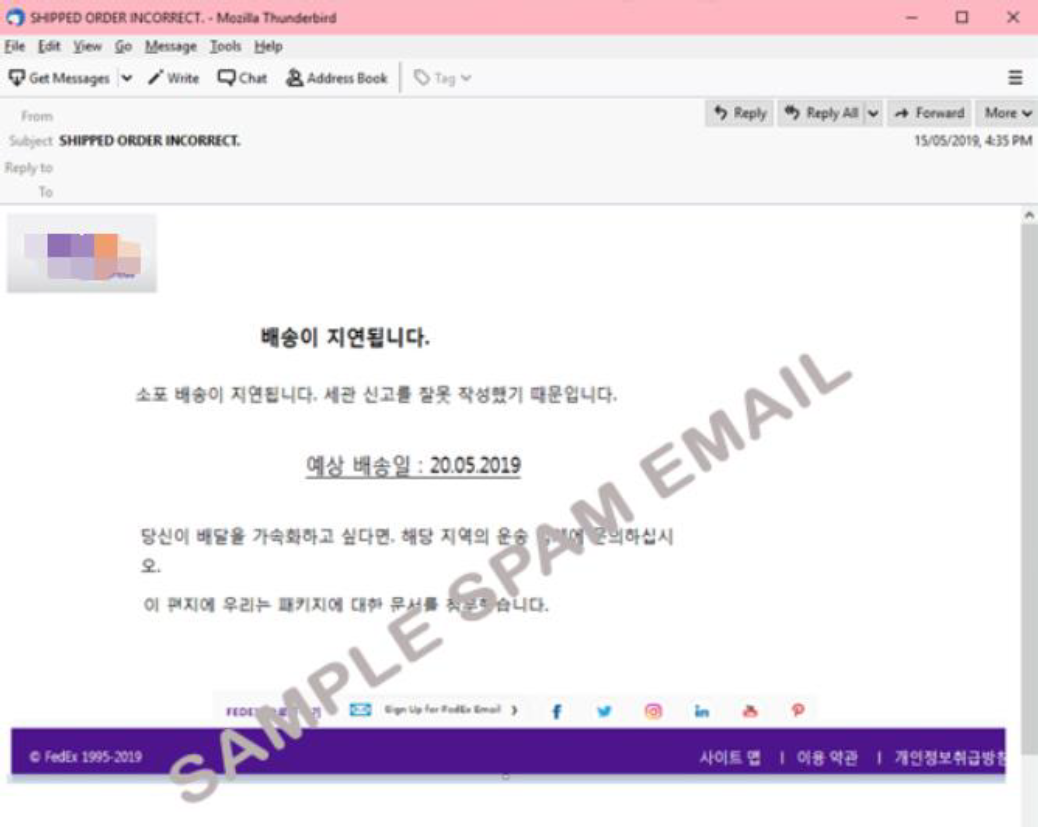 此次截获的垃圾邮件的主题为“SHIPPED ORDER INCORRECT.”,邮件正文则是用韩语撰写的假冒快递公司发送运单通知,附件则是RAR文件,该RAR文件包含一个名为Fedex-info_2019-05-15_02-24.dok的可执行文件,此文件即为GandCrab勒索病毒。