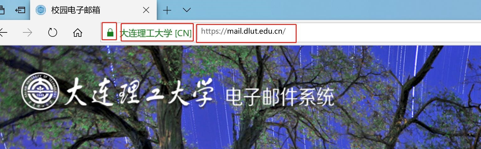 首先请大家认清学校邮件系统地址,我校邮件系统已经安装可信证书,浏览器地址栏中会有可信的锁标识,点击可看到学校名称等信息,邮件系统使用https协议访问,请注意完整的地址信息,如下图红框内所示: