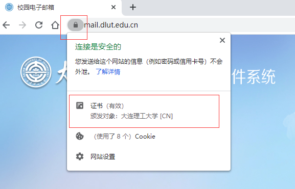 另外,学校邮件系统部署了网络安全证书,浏览器中地址栏会有安全标志,并且证书颁发对象为大连理工大学,下图是以chrome浏览器访问为例,查看证书相关情况: