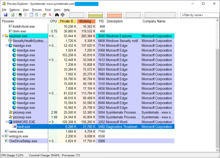 查看在word.exe 或 excel.exe 等父进程下,有无异常新建 msdt.exe相关的子进程:
