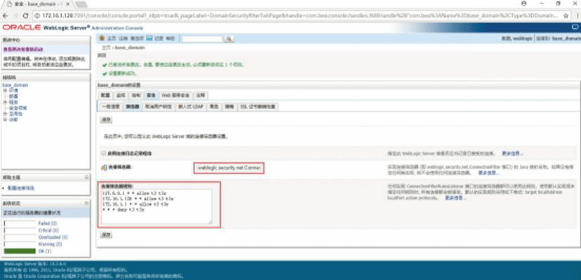 进入WebLogic 控制台,在base_domain 的配置页面中,进入“安全”选项卡页面,点击“筛选器”,进入连接筛选器配置。
